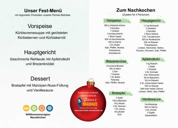 Die Menü-Karten, die ab sofort bei zahlreichen Partnerbetrieben im gesamten Landkreis Neunkirchen ausliegen, enthalten nicht nur die Beschreibung der Gerichte, sondern auch die vollständigen Zutatenlisten für alle drei Gänge zum Nachkochen.